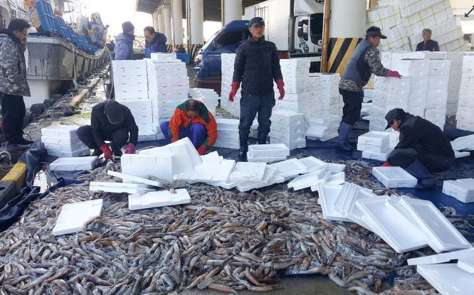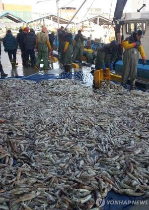据韩联社报道,当地时间2018年1月2日,韩国江原道,在江陵市注文津港,作业归来的渔船大丰收。