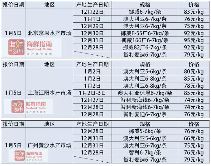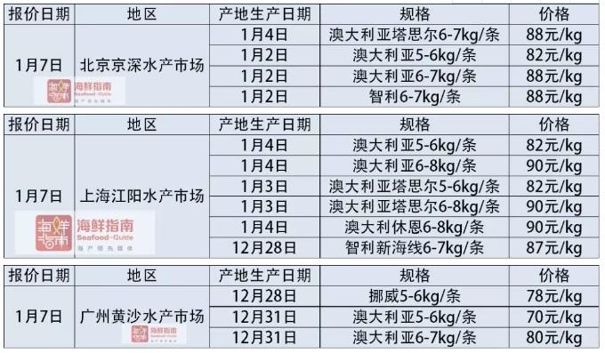 注明:以上价格为各地水产市场冰鲜三文鱼(大西洋鲑)的市场批发销售价格,非零售价格。产地生产日期表示:大西洋鲑从养殖场捕捞并加工完成的日期。大西洋鲑品牌中英文注释:“澳大利亚休恩”即为:Huon;“澳大利亚塔斯尔”即为:Tassal;“智利新海线”即为:New World Currents;“智利麦迪”即为:Multierport Foods;“丹麦皇冠”即为:Bakkafrost;“SSF苏格兰”即为:Scottish Sea Farms;“挪威耕海”即为:Marine Harvest。(文/图 海鲜指南 陈磊)