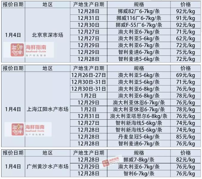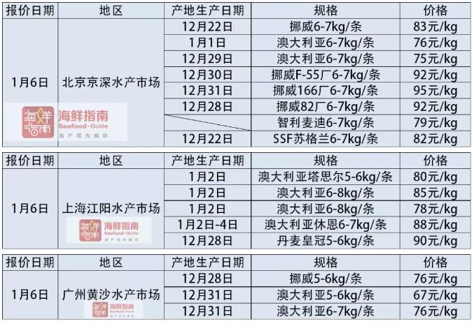 上周,挪威冰鲜三文鱼通关问题依旧没有得到解决,市场上流通的挪威冰鲜三文鱼有明显的减少,预计春节后才有可能缓解。同时澳大利亚的冰鲜三文鱼有明显的涨价,上海1月4日产6-8kg/条的价格已经卖到90元/公斤,少量的挪威冰鲜三文鱼的价格也在90元/公斤以上。法罗群岛的货上周在市场的流通量偏少。